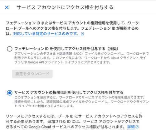 「サービス アカウントの権限借用を使用してアクセス権を付与する」を選択します。