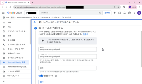 名前とプールIDを入力して「続行」を選択します。