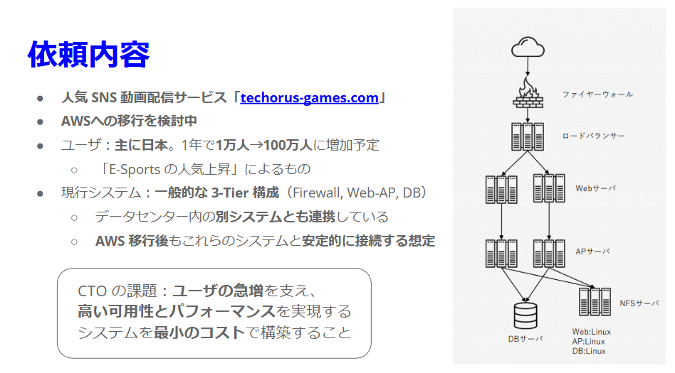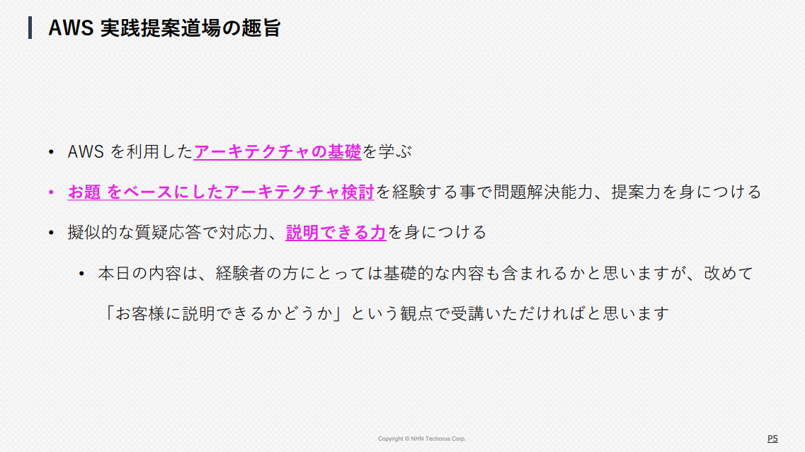 実施目的は、AWS サービスのアーキテクチャと、その提案方法を知ることです。