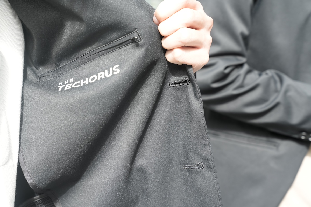 ジャケットの内ポケット下には、NHN テコラスのコーポレートロゴを印刷しました。このNHN テコラスのコーポレートロゴ、実は、超有名デザイナーさんにデザインしていただいたものなんですよ。