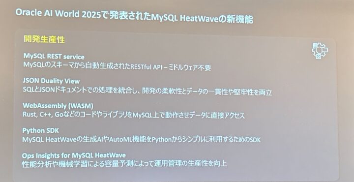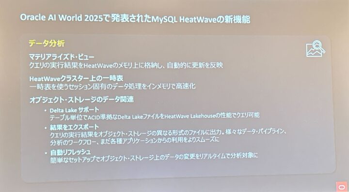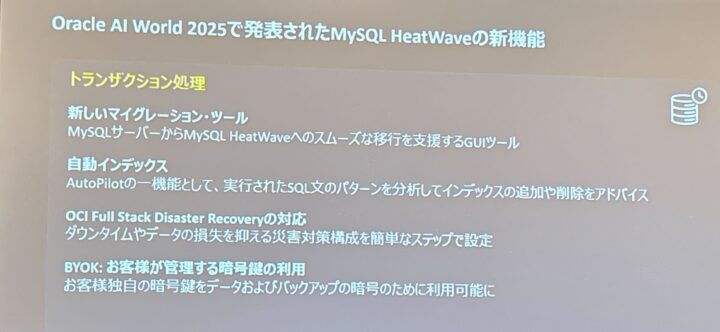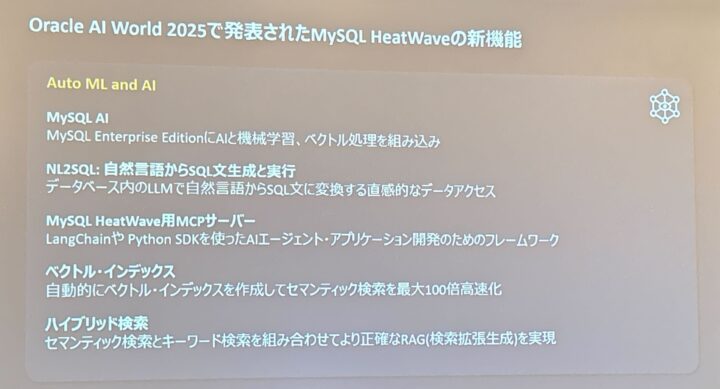 また、10月に開催された Oracle AI World 2025 のアップデートも共有され、HeatWave が AI / LLM 活用に向けてどのように進化を続けているかも紹介されました。