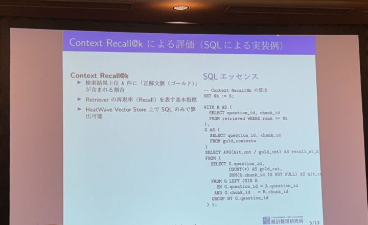 今回のライトニングトークでは、RAG の評価を「検索精度」だけで捉えるのではなく、モデル更新などでベクトル空間がどのように変化したのかを SQL だけで確認するというアプローチが紹介されました。