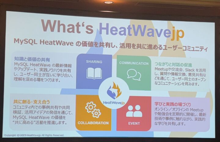 最後のセッションでは、MySQL HeatWave のユーザーコミュニティ「HeatWavejp」が紹介されました。