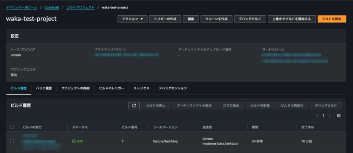 上記yamlではpush時にビルドが実行される設定としておりますので、GitHub Actionsが実行されAWS CodeBuild上でもビルドが成功しているのが確認できるかと思います。