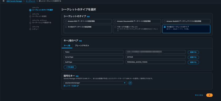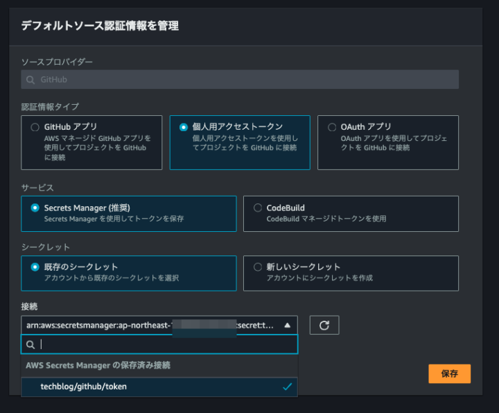 今回はアクセストークンを用いて認証しますので、「個人用アクセストークン」から先程作成したAWS Secrets Managerを選択し、保存します。