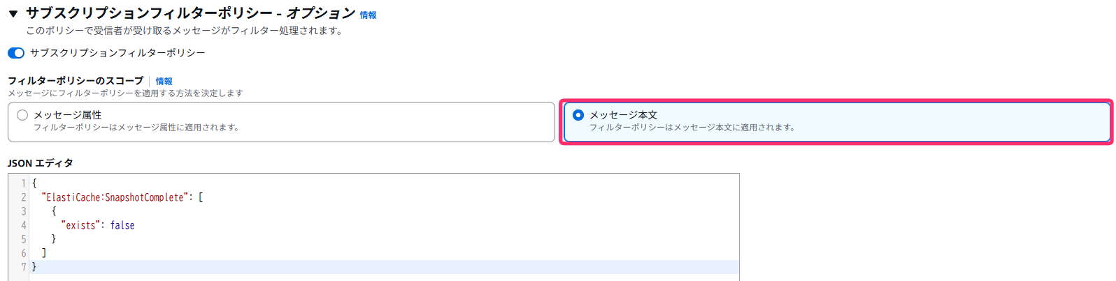 SNSのサブスクリプション設定で、メッセージ本文をスコープとするフィルターポリシーを設定します。