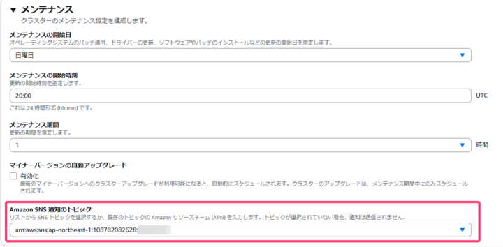 ElastiCache側のメンテナンス設定画面で、先ほど作成したSNSトピックを指定します。