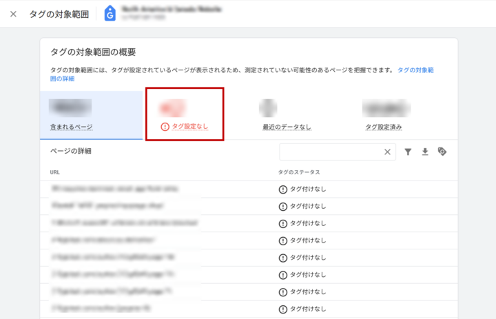 「タグ設定なし」をクリックすると、その下に現在タグが設置されていないページがリスト表示されます。