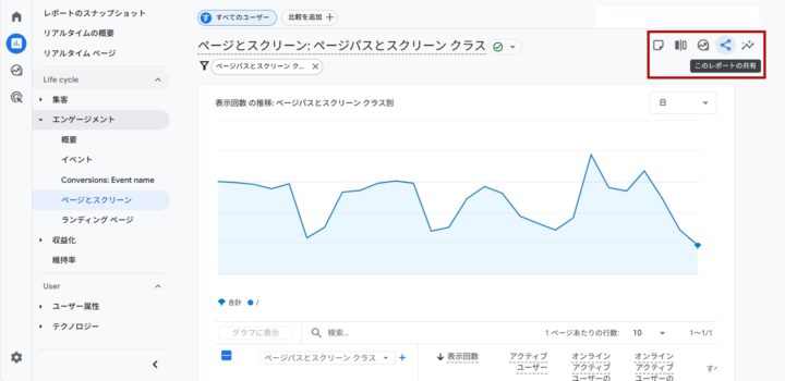 - まず、GA4のレポート画面を開き、「ページとスクリーン」レポートに移動します。