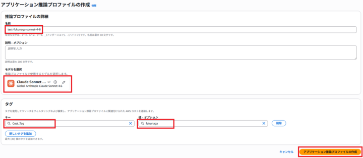 2. 以下の値を入力し、「アプリケーション推論プロファイルの作成」を押下