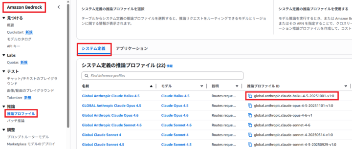 各モデルの推論プロファイル ID については、「Amazon Bedrock コンソール」>「推論」>「推論プロファイル」>「システム定義」の各モデルから確認することが可能です。