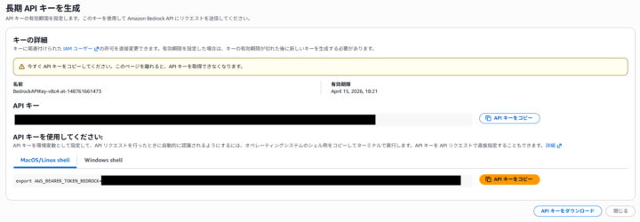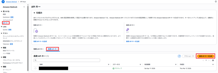 (1) Amazon Bedrock のコンソールから「API キー」>「長期 API キー」を選択し、「長期 API キーを生成」を押下