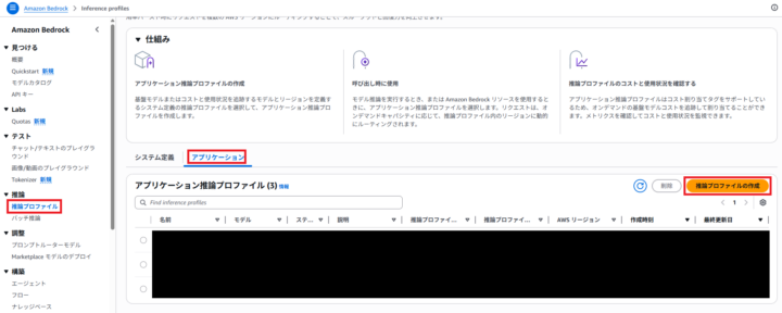 1. 「Amazon Bedrock コンソール」>「推論」>「推論プロファイル」>「アプリケーション」へ遷移し、「推論プロファイルの作成」を押下する
